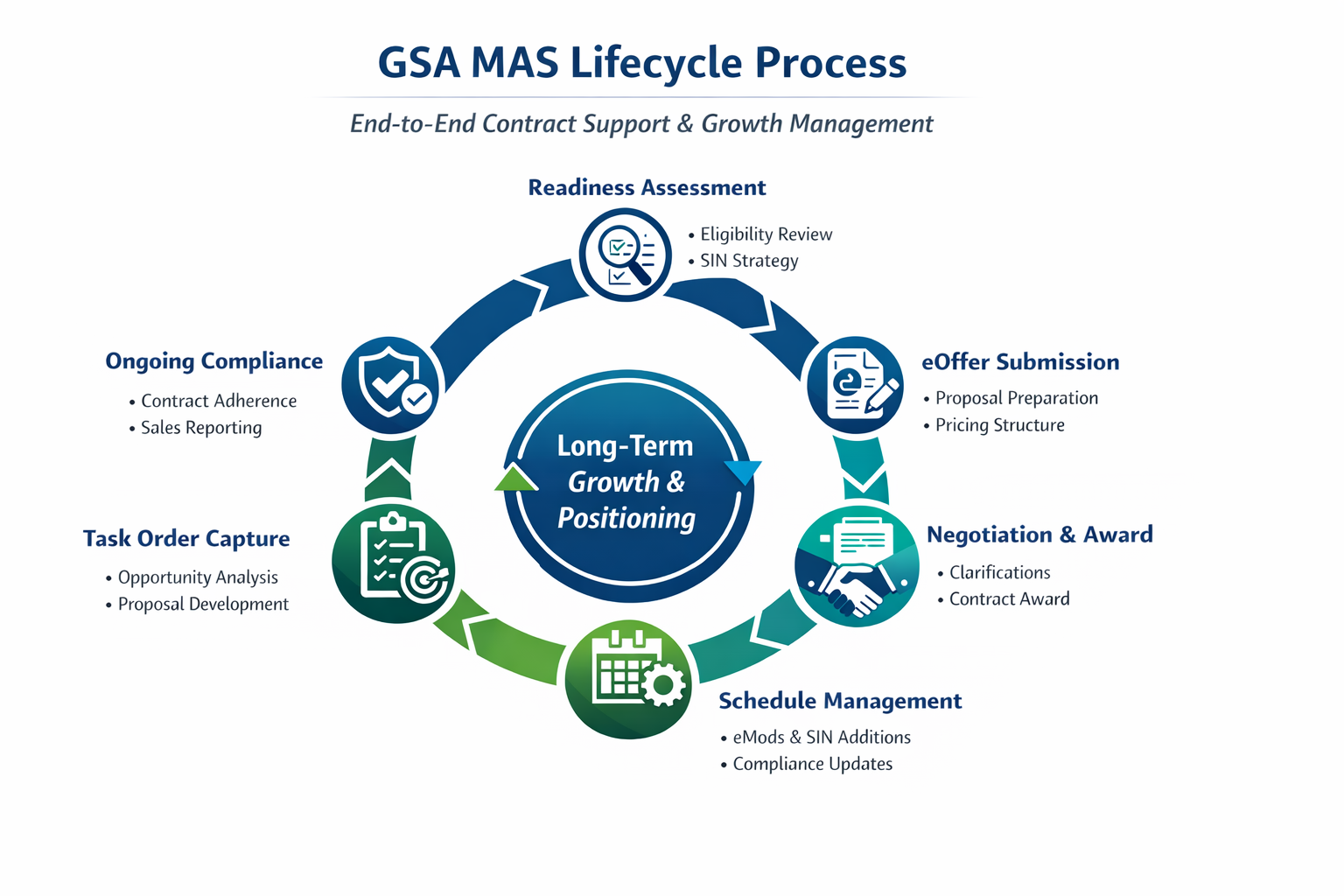 Beyond GSA MAS, we support participation across major federal vehicles, helping clients not only secure awards — but remain competitive and growth-focused over the long term.